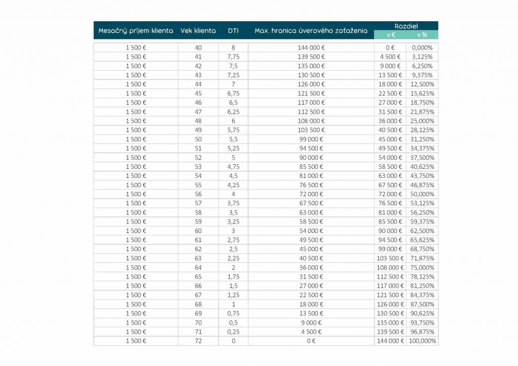 Po novom sa žiadateľom o úver nad 40 rokov, ktorým splatnosť úveru presahuje do dôchodku bude postupne znižovať maximálne DTI, teda pomer dlhu k príjmom. Dnes si klient môže od banky štandardne požičať 8-násobok svojho ročného príjmu. Nová úprava NBS navrhuje, aby sa maximálna výška úveru znižovala o 0,25 násobok čistého ročného príjmu klienta za každý rok presahujúci 40 rokov. To znamená, že 41-ročný klient si tak bude môcť požičať už len 7,75 násobok svojho ročného príjmu a 50- ročný klient len 5,5 násobok svojho príjmu.